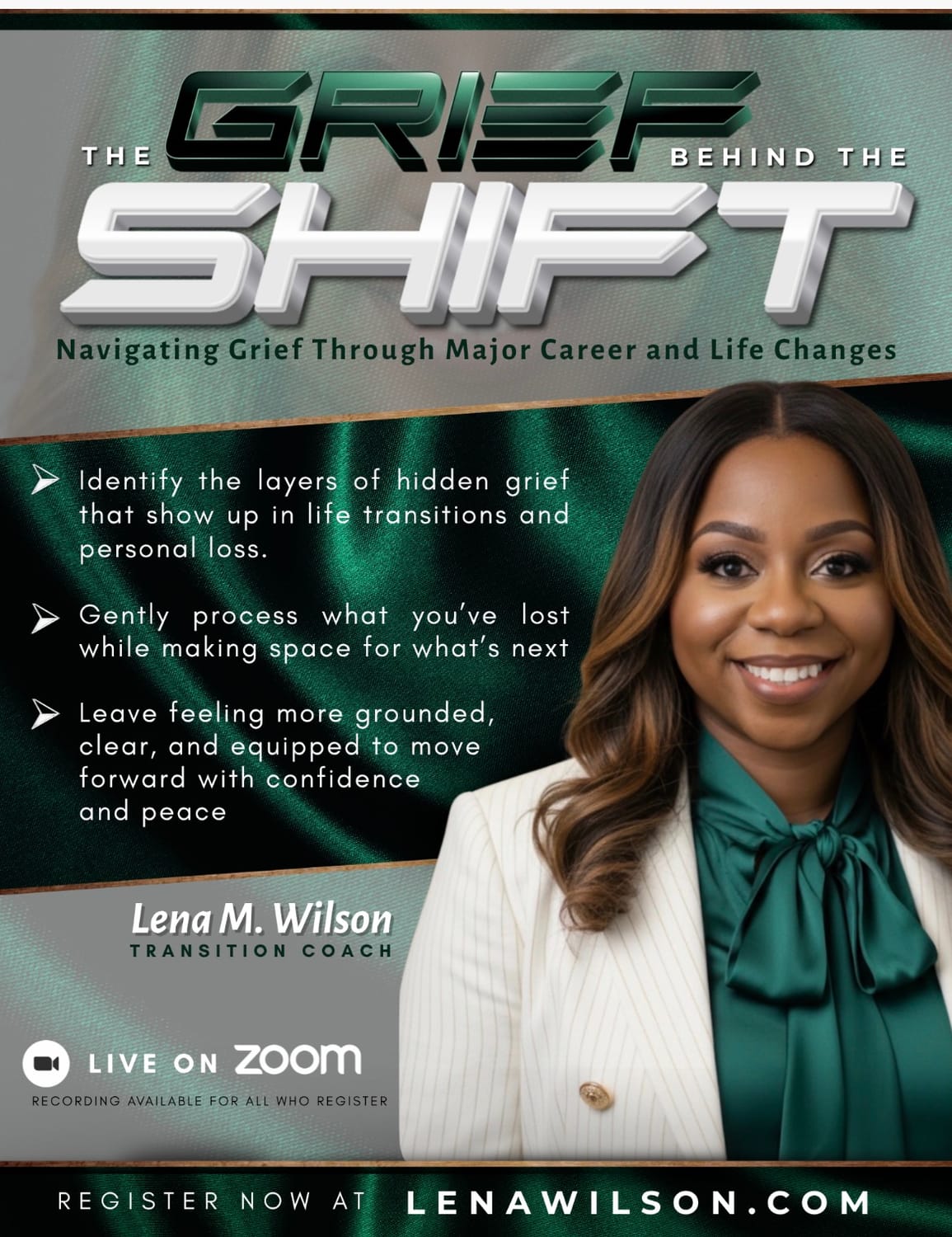 Just got out of the Grief Behind the Shift Masterclass tonight. Lena Wilson is phenomenal as a Transition Coach. We do not need to journey grief, emotional pain, and transition alone.